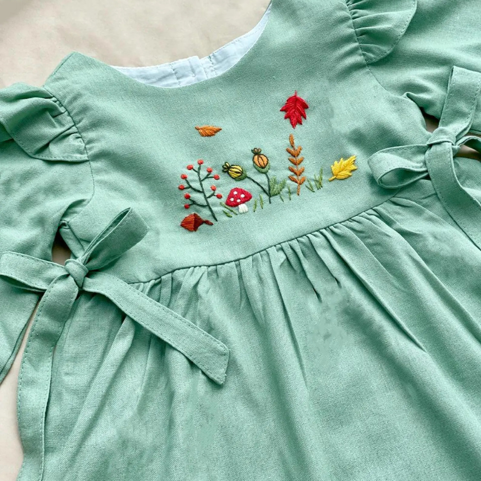 ชุดเดรสผ้าลินินปักทำด้วยมือสำหรับเด็กผู้หญิงสไตล์ลำลองสำหรับวันเกิดครั้งแรกของเด็กวัยหัดเดินผลิตในเวียดนาม