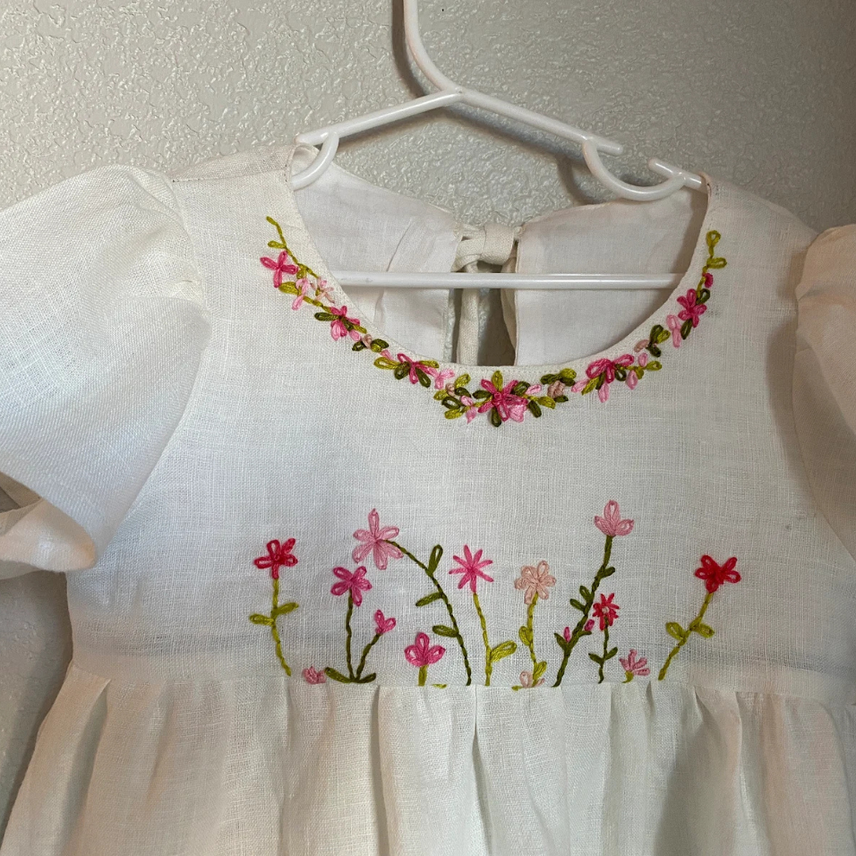 ชุดเดรสผ้าลินินปักทำด้วยมือสำหรับเด็กผู้หญิงสไตล์ลำลองสำหรับวันเกิดครั้งแรกของเด็กวัยหัดเดินผลิตในเวียดนาม