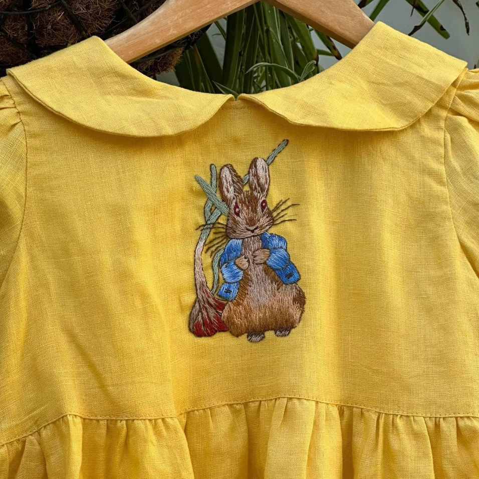 ชุดเดรสผ้าลินินปักทำด้วยมือสำหรับเด็กผู้หญิงสไตล์ลำลองสำหรับวันเกิดครั้งแรกของเด็กวัยหัดเดินผลิตในเวียดนาม