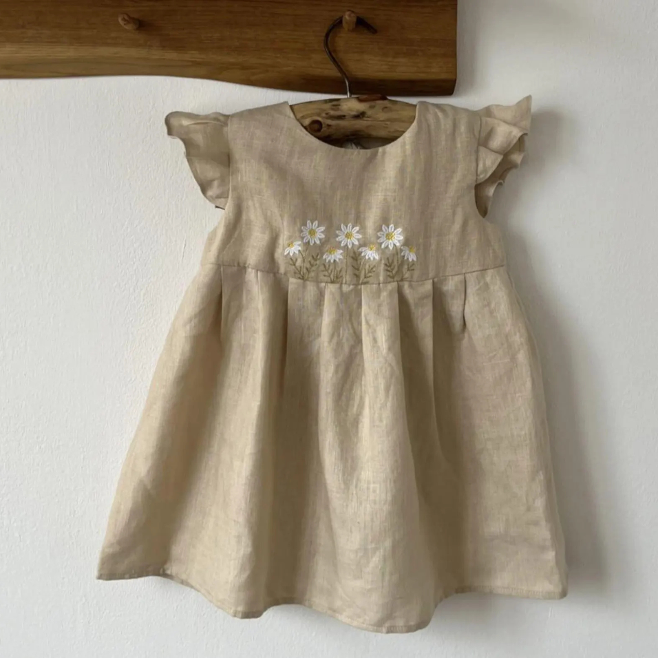 ชุดเดรสผ้าลินินปักทำด้วยมือสำหรับเด็กผู้หญิงสไตล์ลำลองสำหรับวันเกิดครั้งแรกของเด็กวัยหัดเดินผลิตในเวียดนาม