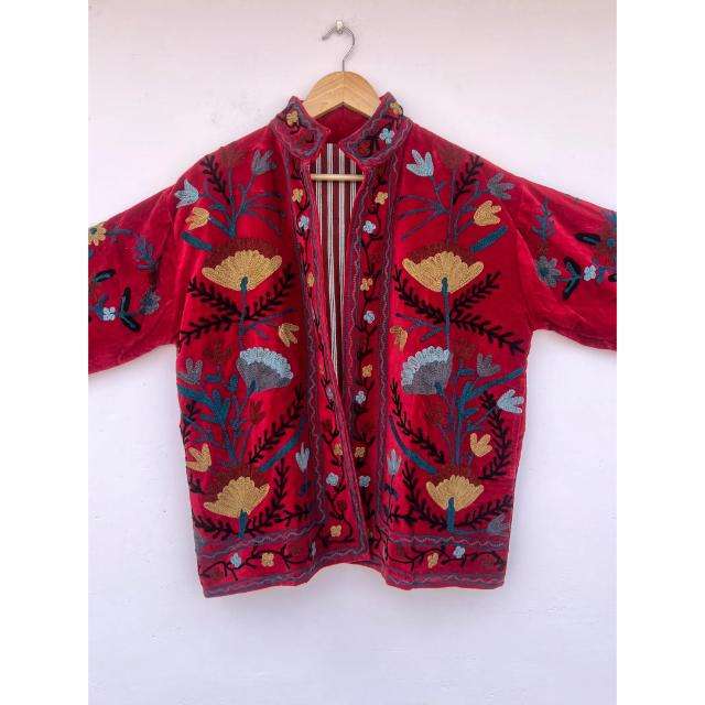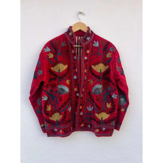 เสื้อแจ็คเก็ตผ้ากำมะหยี่ปักลายซูซานีทำมือ สำหรับฤดูใบไม้ร่วงและฤดูหนาว ผ้าฝ้าย สไตล์โบโฮ ทรงบอมเบอร์ ของขวัญสุดชิคสำหรับเธอ