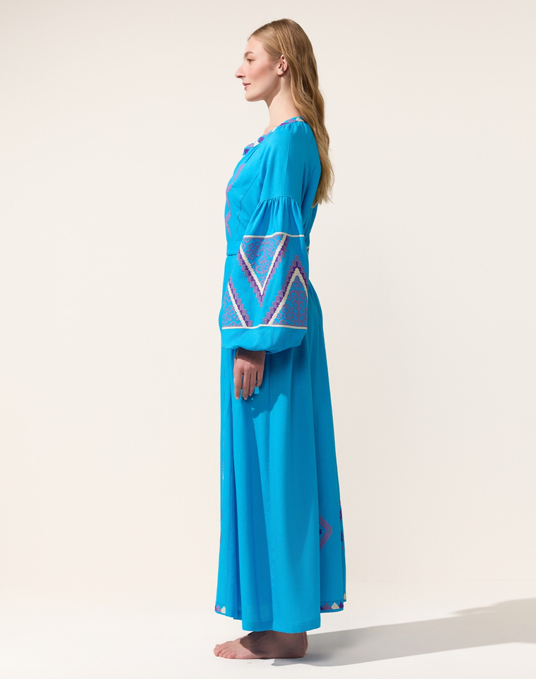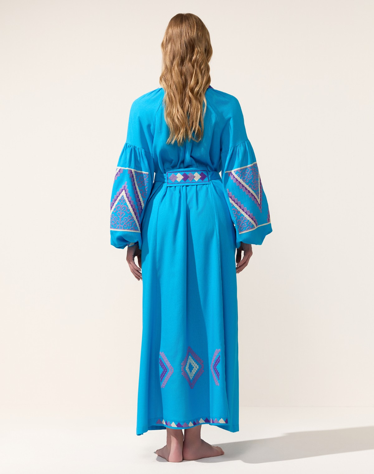 โบฮีเมียน Vyshyvanka เข็มขัดยาวถึงพื้นแขนพองเป็นมิตรต่อสิ่งแวดล้อมทำด้วยมือสไตล์ยูเครนสีฟ้าของผู้หญิง