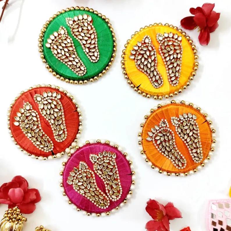 ชุดรอยเท้าพระลักษมี งานฝีมือจากผ้า/ไม้เอ็มดีเอฟ ขนาด 4 นิ้ว ประดับด้วยงานศิลปะคันดัน ชารัน ปาดูกา สำหรับพิธีบูชาในเทศกาลดีวาลี นาฟราตรี หรืองานขึ้นบ้านใหม่