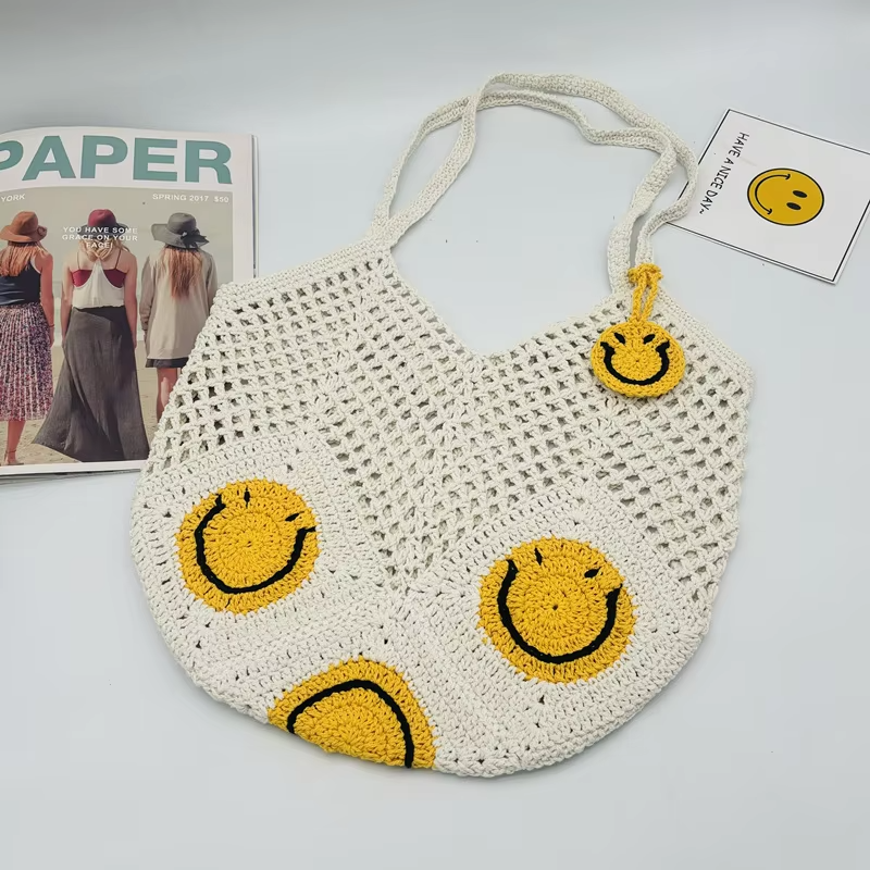 กระเป๋าชายหาดถักโครเชต์ทรงสี่เหลี่ยมผ้าฝ้ายทำมือ ขนาดใหญ่ รักษ์โลก ดีไซน์เรขาคณิต ใช้งานได้หลากหลาย สไตล์ลำลอง งานศิลปะ