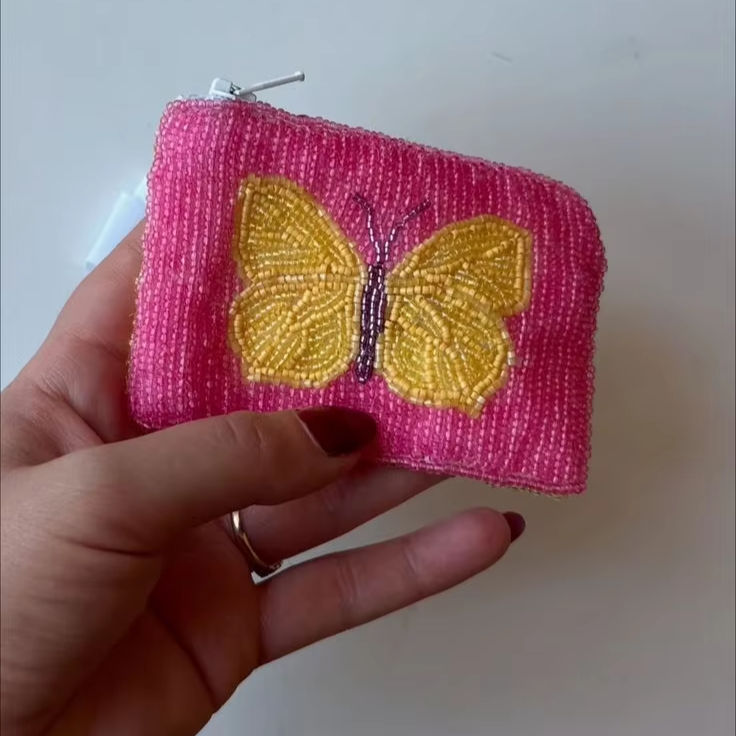 กระเป๋าใส่เหรียญแฟชั่นทำด้วยมือรูปผีเสื้อปักด้วยลูกปัดสีเหลืองและสีชมพูแฟนซีหรูหราพร้อมสัมผัสระดับพรีเมียมจากบริษัทฮิบา