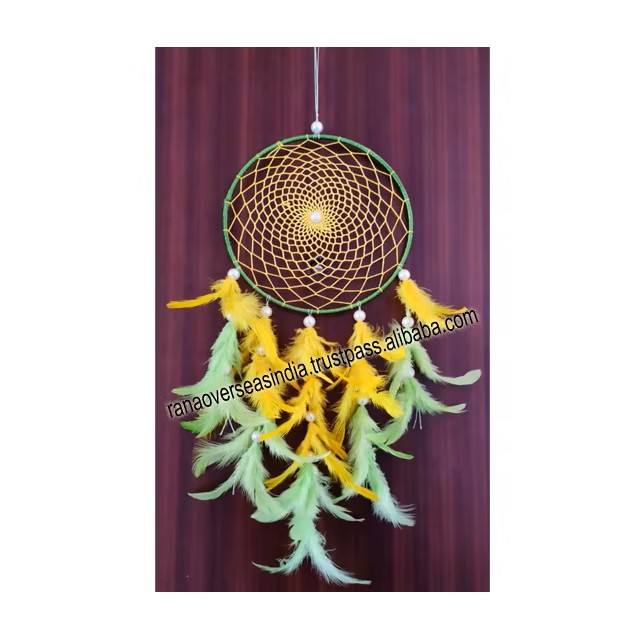 เครื่องดักความฝันขนนกทำด้วยมือสีเขียวและสีเหลืองสำหรับระเบียงสวนงานปาร์ตี้และคาเฟ่