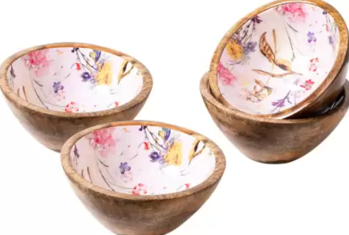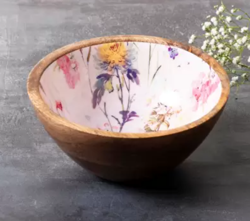 ชามไม้ทรงกลมสำหรับใส่ผลไม้อบแห้งดีไซน์พิมพ์ลายปลาทำด้วยมือ