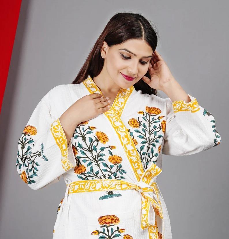 ชุดกิโมโนผ้าวาฟเฟิลสำหรับสตรีชุดคลุมผ้าฝ้ายสำหรับใส่นอนหรือของขวัญสำหรับเพื่อนเจ้าสาวดีไซน์ลายดอกไม้งานแฮนด์เมด