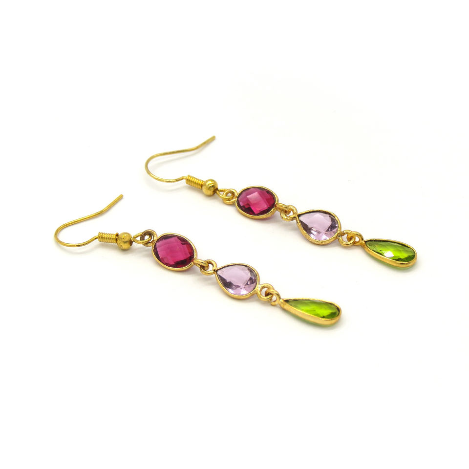 ต่างหูห้อยประดับพลอยหลากสีสไตล์โบฮีเมียนทำมือ | เพอริดอทสีชมพูฟิวเซีย | ต่างหูทอง 18K ชุบ ปราศจากนิกเกิล ทำจากทองเหลือง