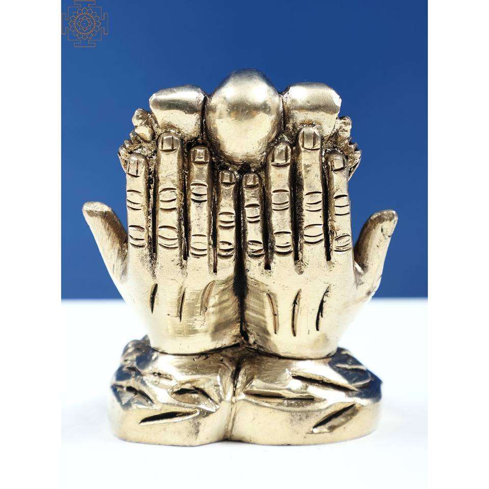 รูปปั้นพระพิฆเนศสี่แขนทำด้วยมือวางอยู่บนฝ่ามือของรูปปั้นทองเหลืองชั้นดี