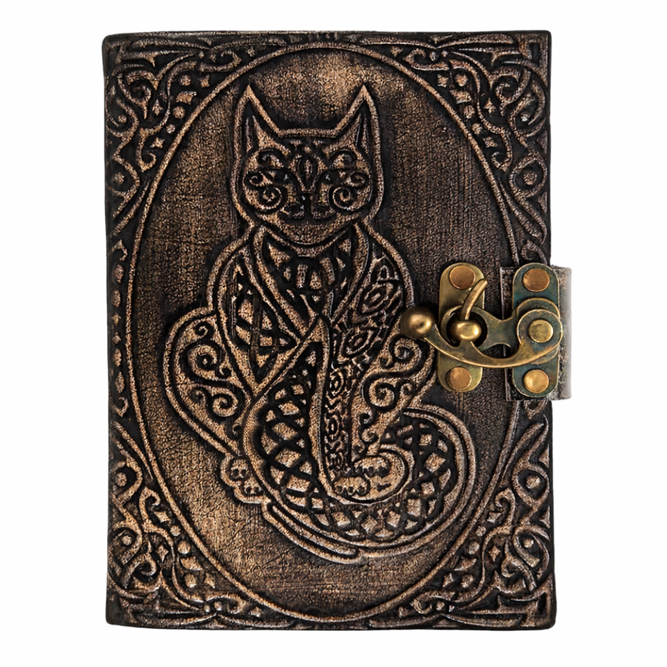 สมุดบันทึกหนังแท้ทำมือขนาด A6 - สมุดบันทึกสำหรับเดินทางลายแมวแบบนูน พร้อมเย็บเข้าเล่ม เหมาะสำหรับเป็นของขวัญ