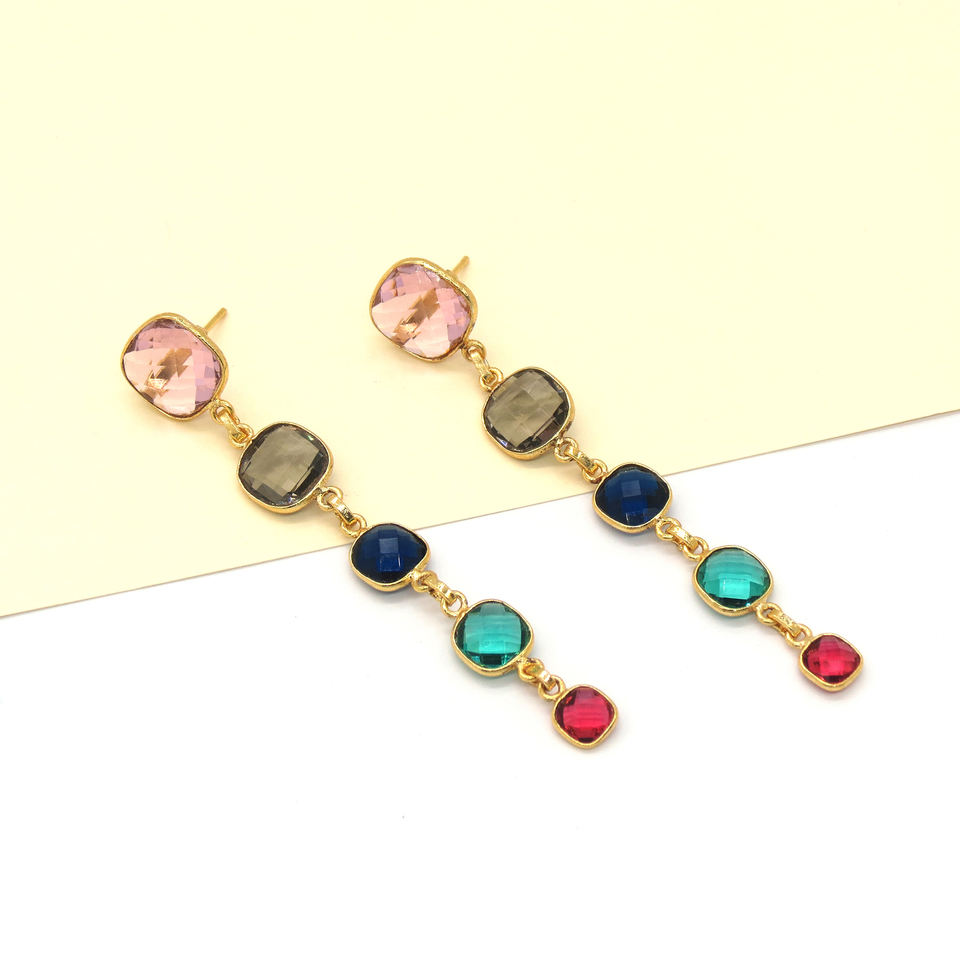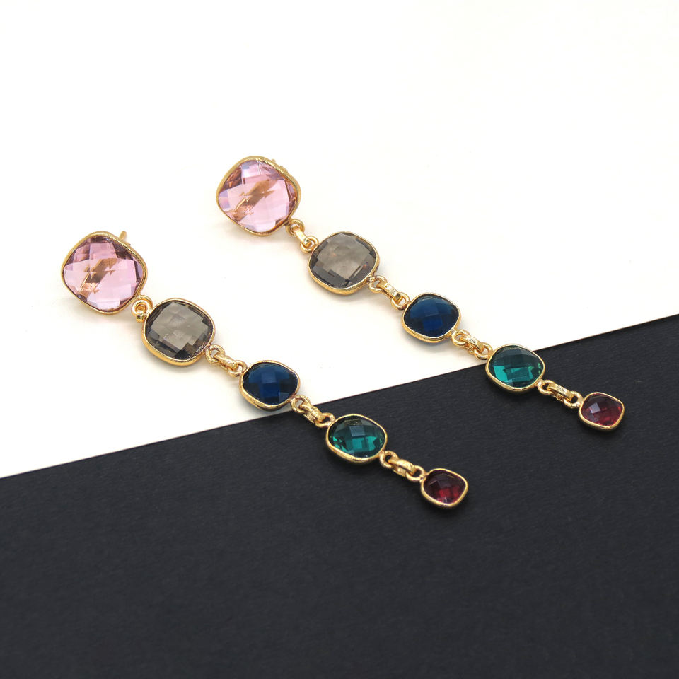 ต่างหูห้อยประดับอัญมณีหลากชนิด สไตล์โบฮีเมียน รูปทรงเรขาคณิต ทำด้วยมือ | โรสควอตซ์ สม็อคกี้ควอตซ์ ไอโอไลต์ อะพาไทต์ ชมพู ฟิวเชีย | 18K