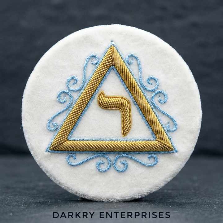 ป้ายปักลายสามเหลี่ยมโยด ตราสัญลักษณ์ลอดจ์แห่งความสมบูรณ์แบบระดับ 14 ของสมาคมเมสัน ทำด้วยมือจากลวดทองคำแท้ ผู้เชี่ยวชาญด้านงานปักแบบสั่งทำพิเศษ