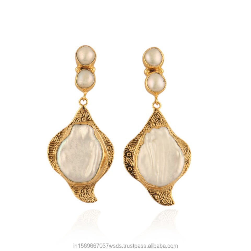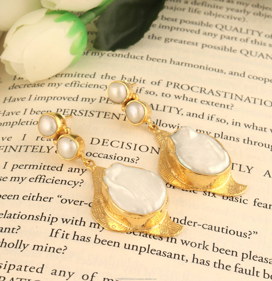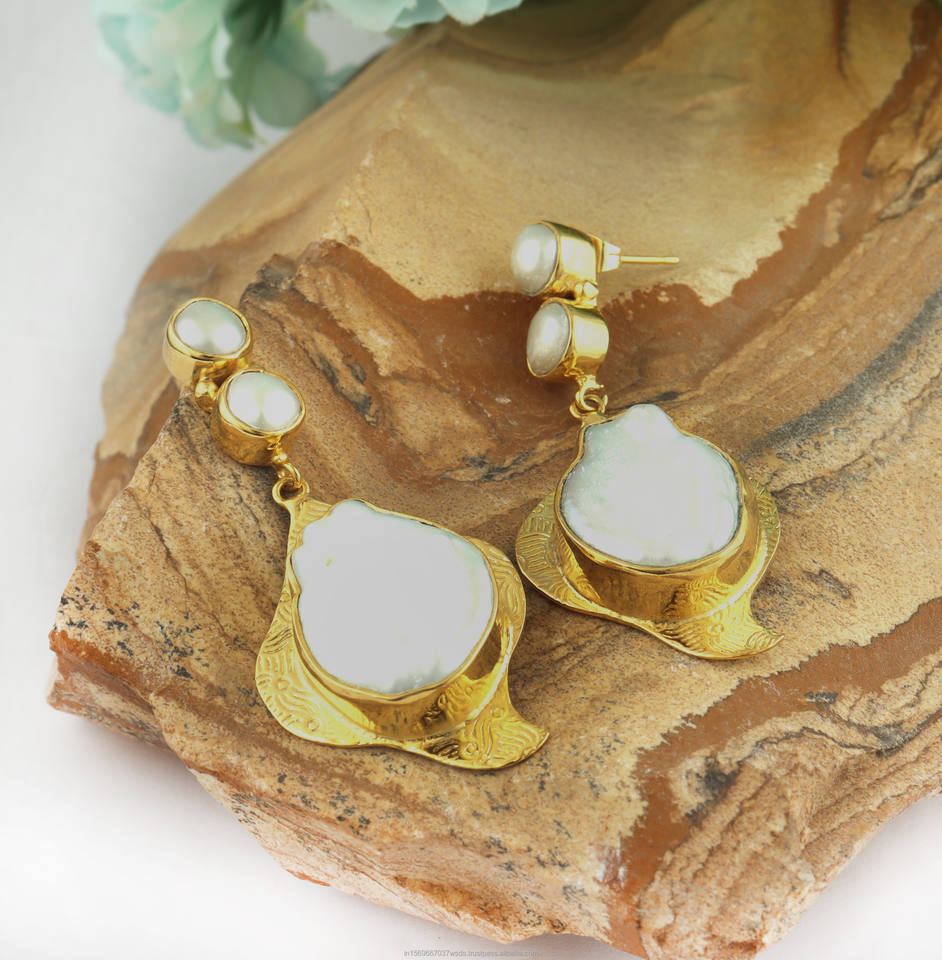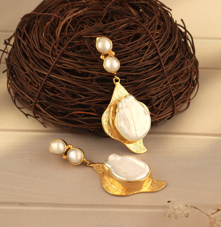 ต่างหูไข่มุกบาร็อคชุบทองทำด้วยมือต่างหูไม่สมมาตรไม่เหมือนใครสำหรับผู้หญิง