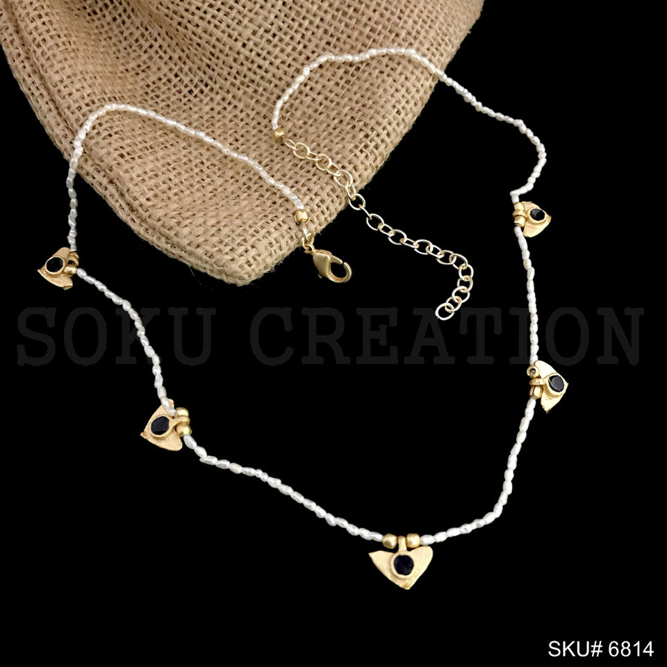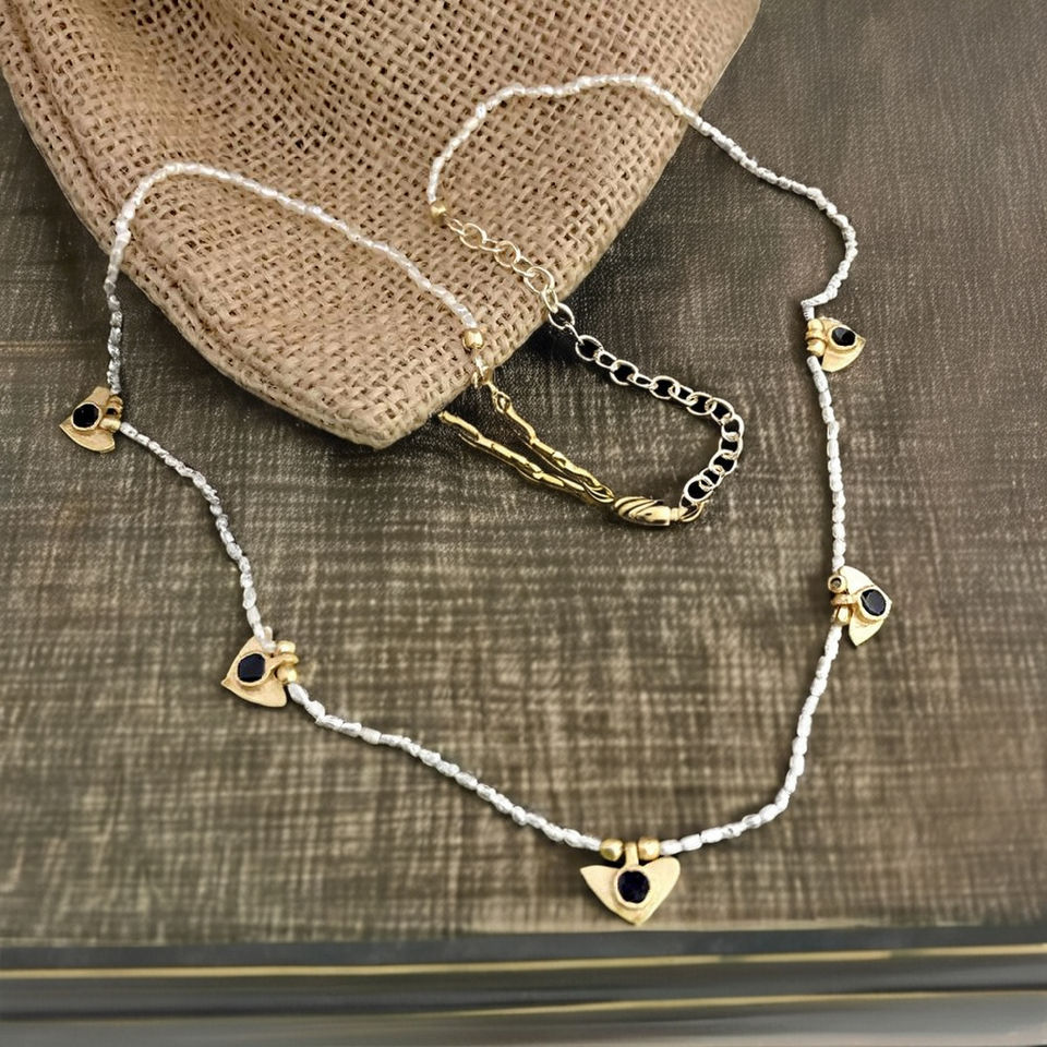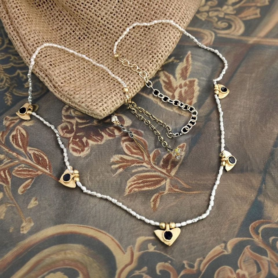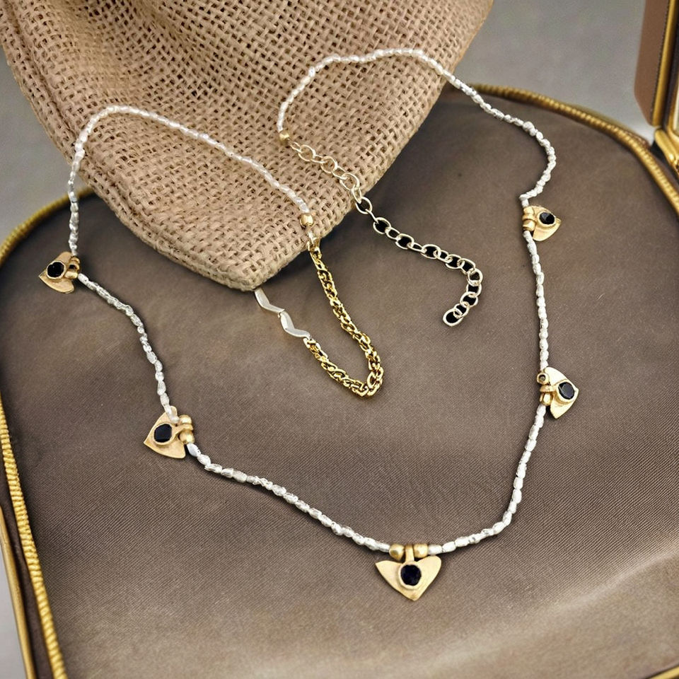สร้อยคอโซ่ทองเหลืองชุบทองทำด้วยมือลูกปัดไข่มุกเคลือบสีดำดีไซน์สามเหลี่ยมขนาดเล็กคริสเตียนสำหรับวันครบรอบ