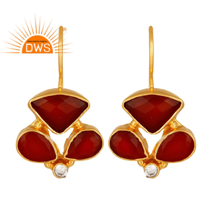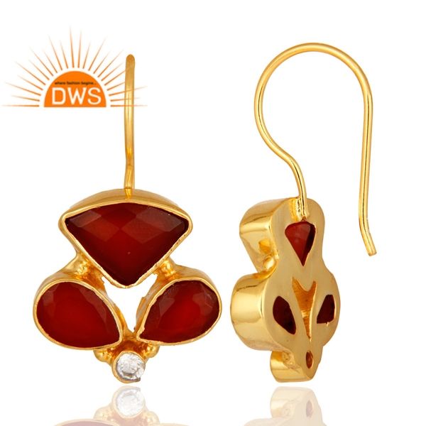 ต่างหูห้อยแบบตะขอทำมือ ชุบทองเหลือง ประดับด้วยพลอยออนิกซ์สีแดงและเพชร CZ คอลเลคชั่นคลาสสิก ขายส่งเครื่องประดับแฟชั่น