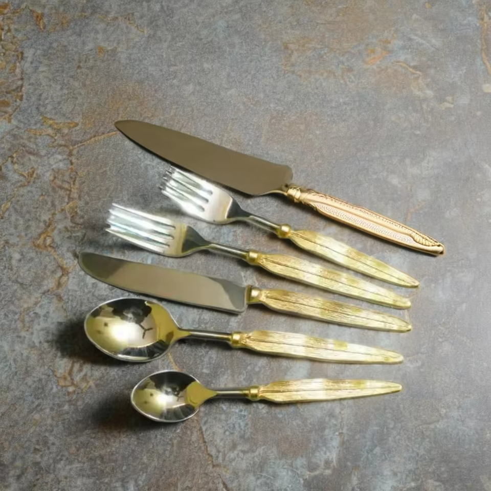 ชุดช้อนส้อมโลหะชุบทองทำด้วยมือด้ามจับใบมีดดีไซน์เป็นมิตรกับสิ่งแวดล้อมรวมถึงเครื่องใช้บนโต๊ะอาหารที่ใช้ช้อนส้อมมีดแบบธรรมดางานปาร์ตี้