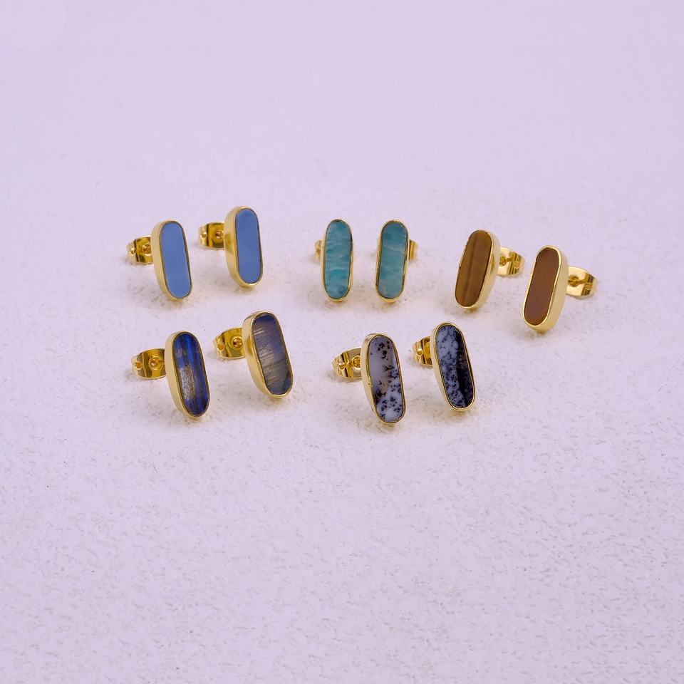 ต่างหูแบบติดหูทรงเรขาคณิตประดับโอปอลสีน้ำเงิน ดีไซน์มินิมอล ทำจากสแตนเลสชุบทอง งานแฮนด์เมด ทันสมัย โดดเด่นไม่ซ้ำใคร