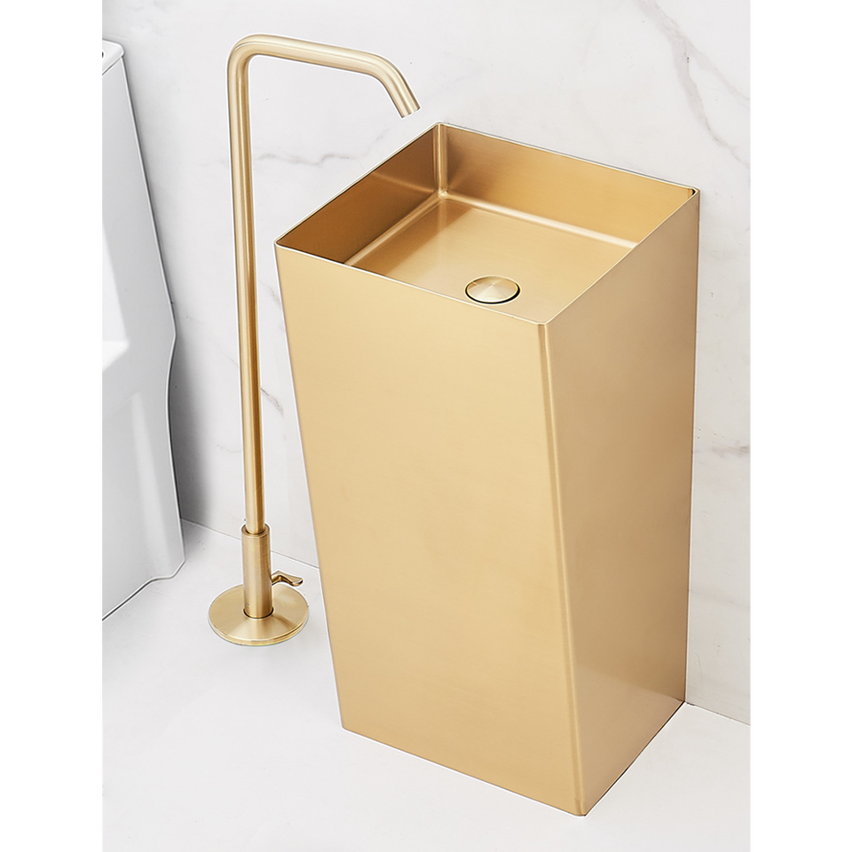 อ่างล้างหน้าสแตนเลสคอลัมน์เดียวสีทองทำด้วยมือ304ทองขัดพื้นผิวดีไซน์ทันสมัยอ่างล้างจานหนึ่งรูสำหรับโรงแรม
