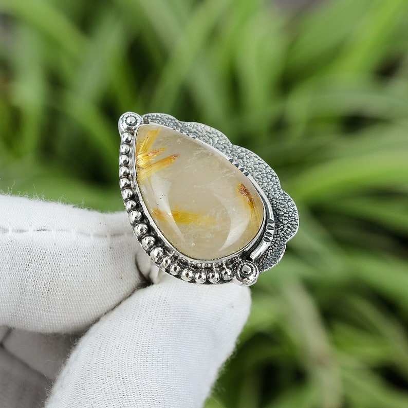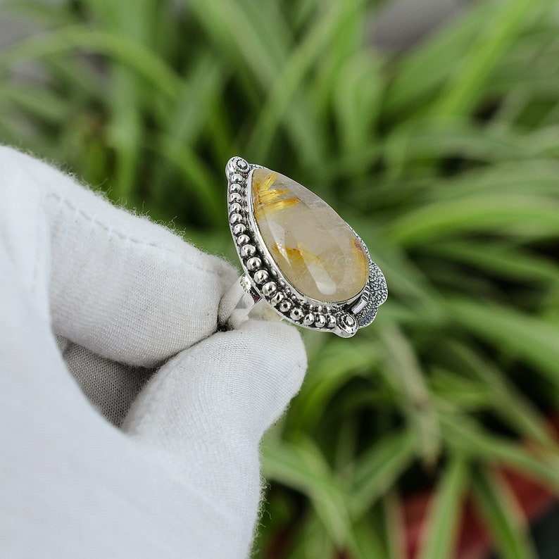 แหวนรูปทรงลูกแพร์ประดับรูไทล์สีทองทำมือ เครื่องประดับเงินแท้สไตล์โบฮีเมียน แหวนควอตซ์รูไทล์ธรรมชาติ ขนาด 675 สำหรับผู้หญิง