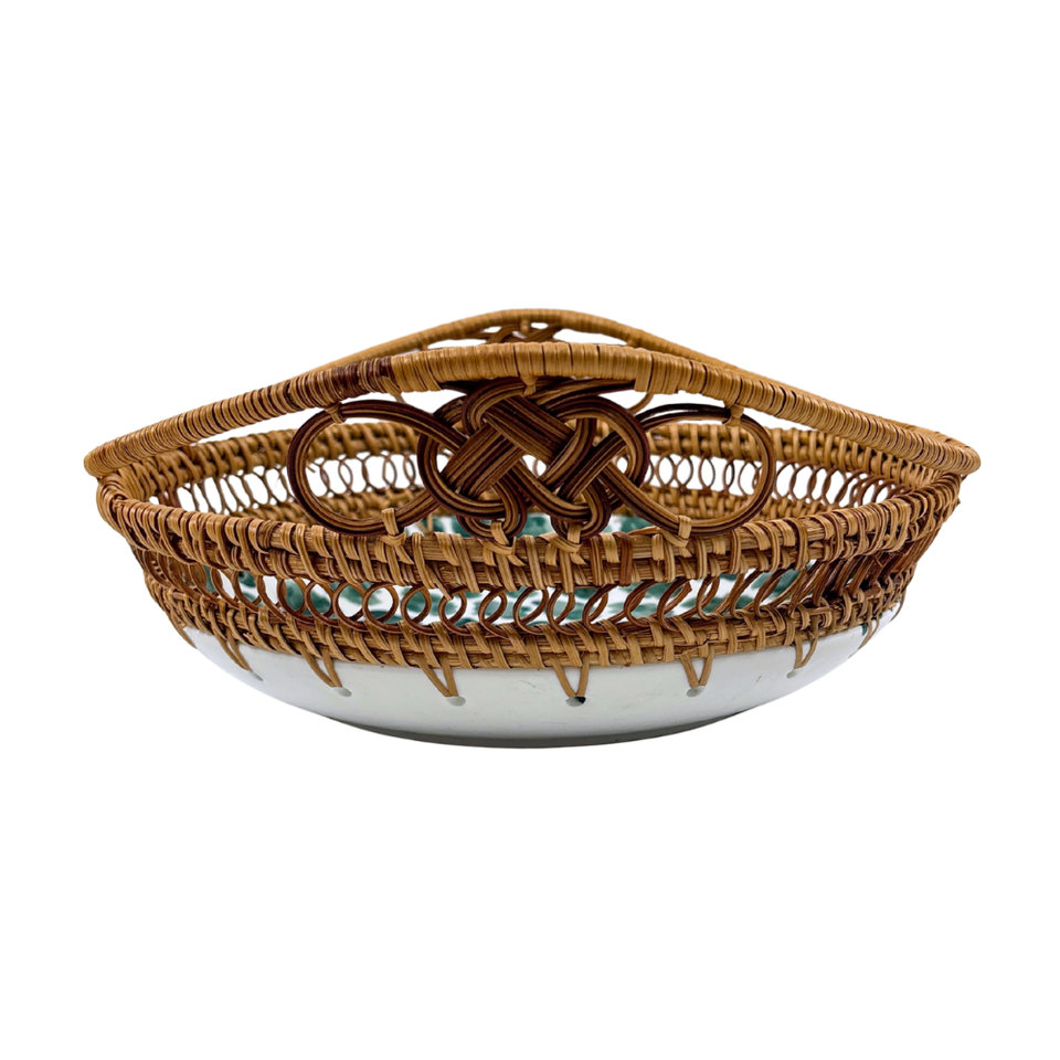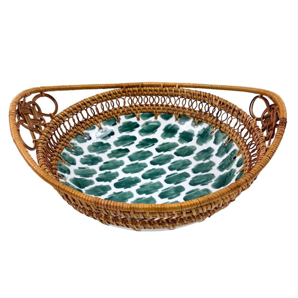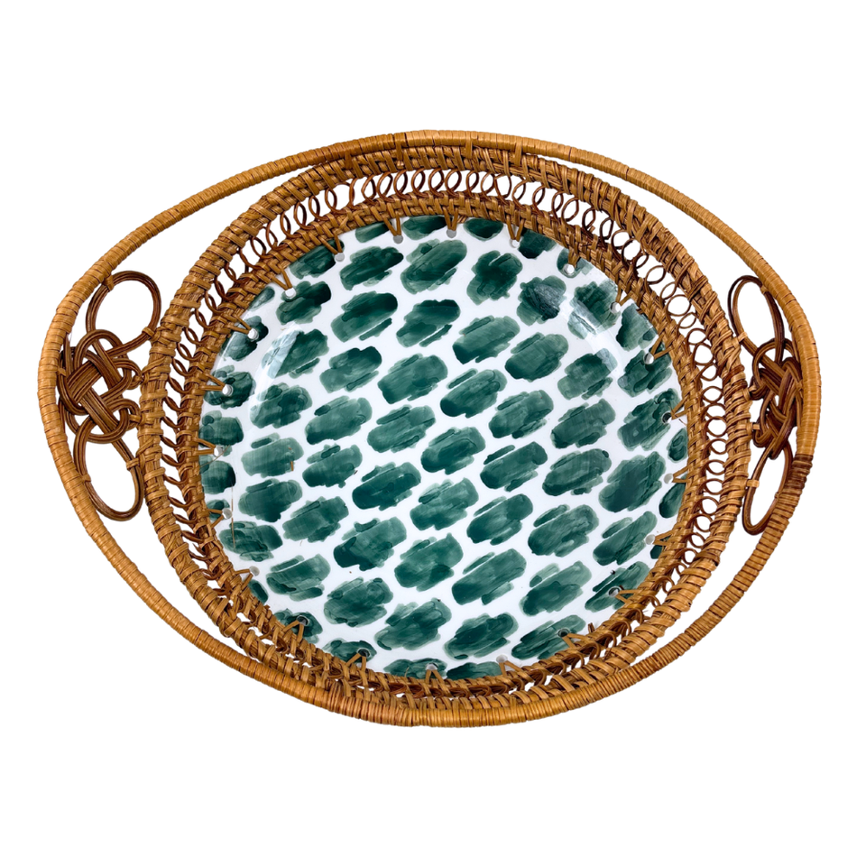 ถาดเสิร์ฟเซรามิกสีเขียวทำด้วยมือพร้อมด้ามหวายสานลายแปรงสำหรับรับประทานอาหารในบ้านหรือตกแต่งงานปาร์ตี้