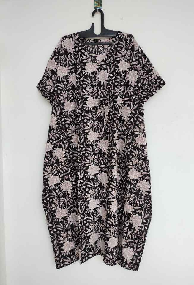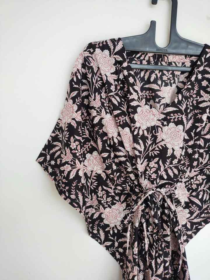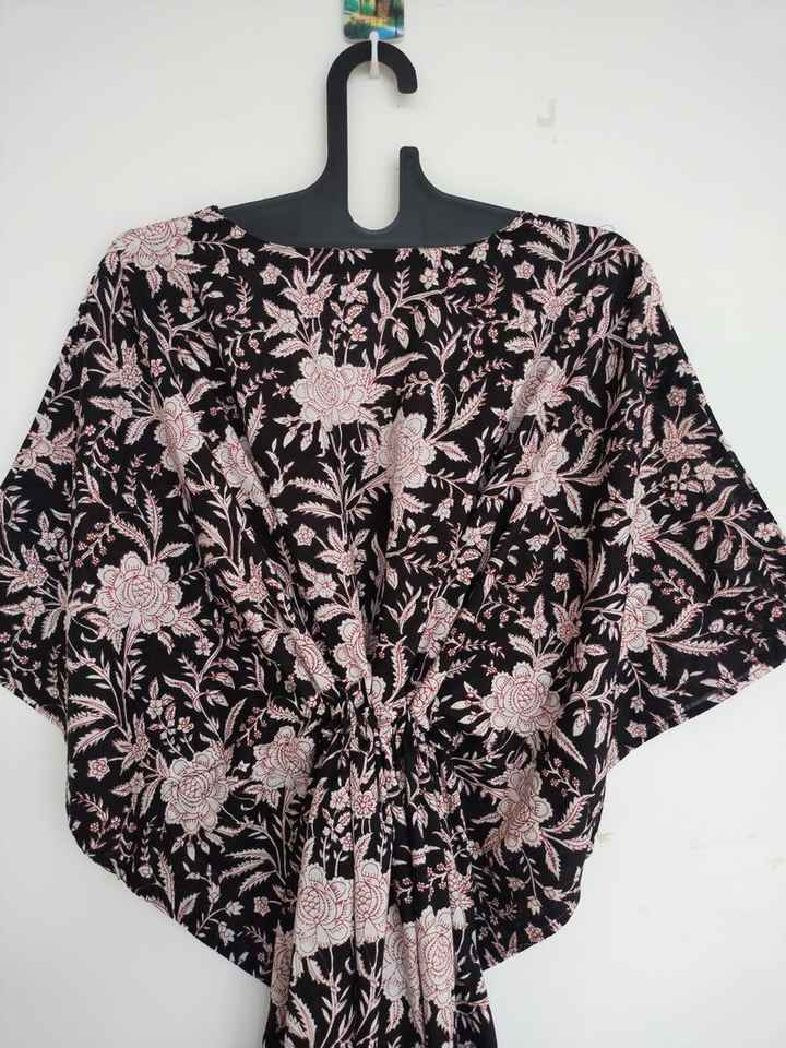 ชุดเดรสผ้าฝ้ายสีเขียวลายดอกไม้ทำมือ สไตล์อินเดีย คิโมโน โรบ น้ำหนักเบา เหมาะสำหรับใส่เที่ยวพักผ่อนสไตล์โบฮีเมียน