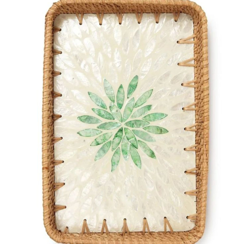 ถาดรองหวายสีเขียวทำด้วยมือพร้อมฝังมุกถาดรองแก้วกาแฟหวายสานธรรมชาติน้ำหนักเบาหรูหราตกแต่งบ้าน