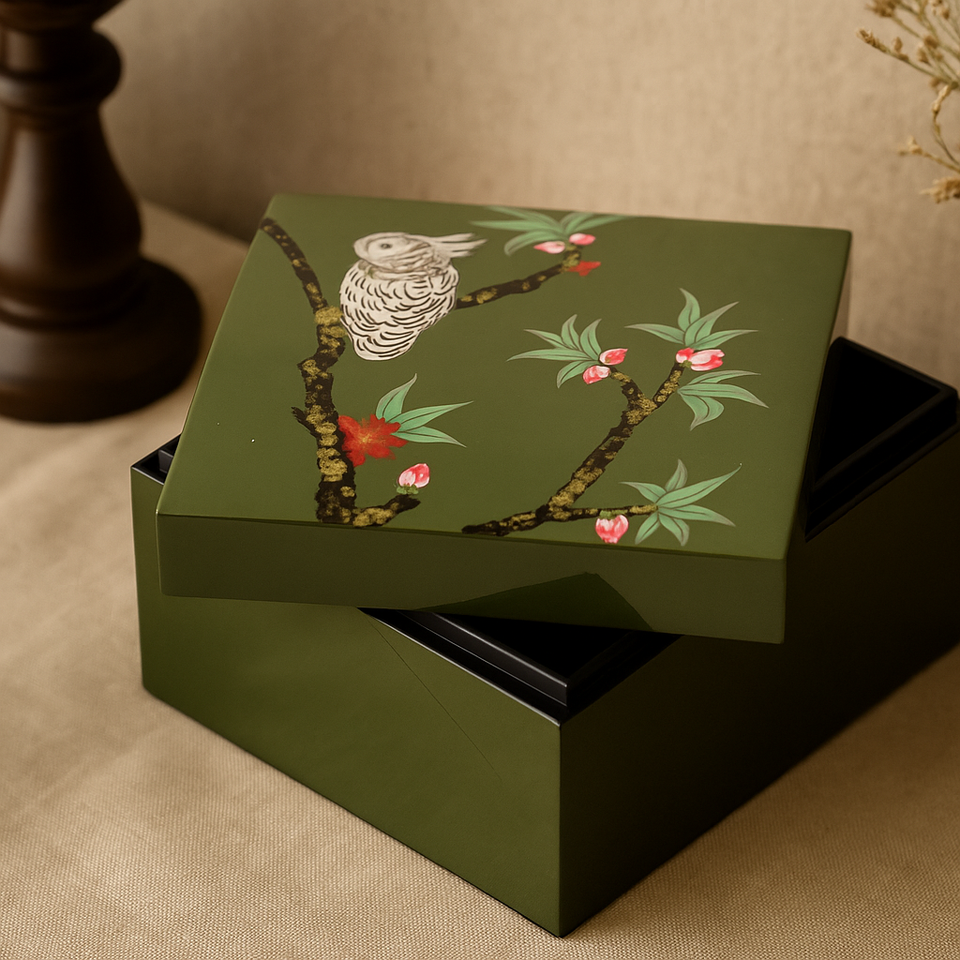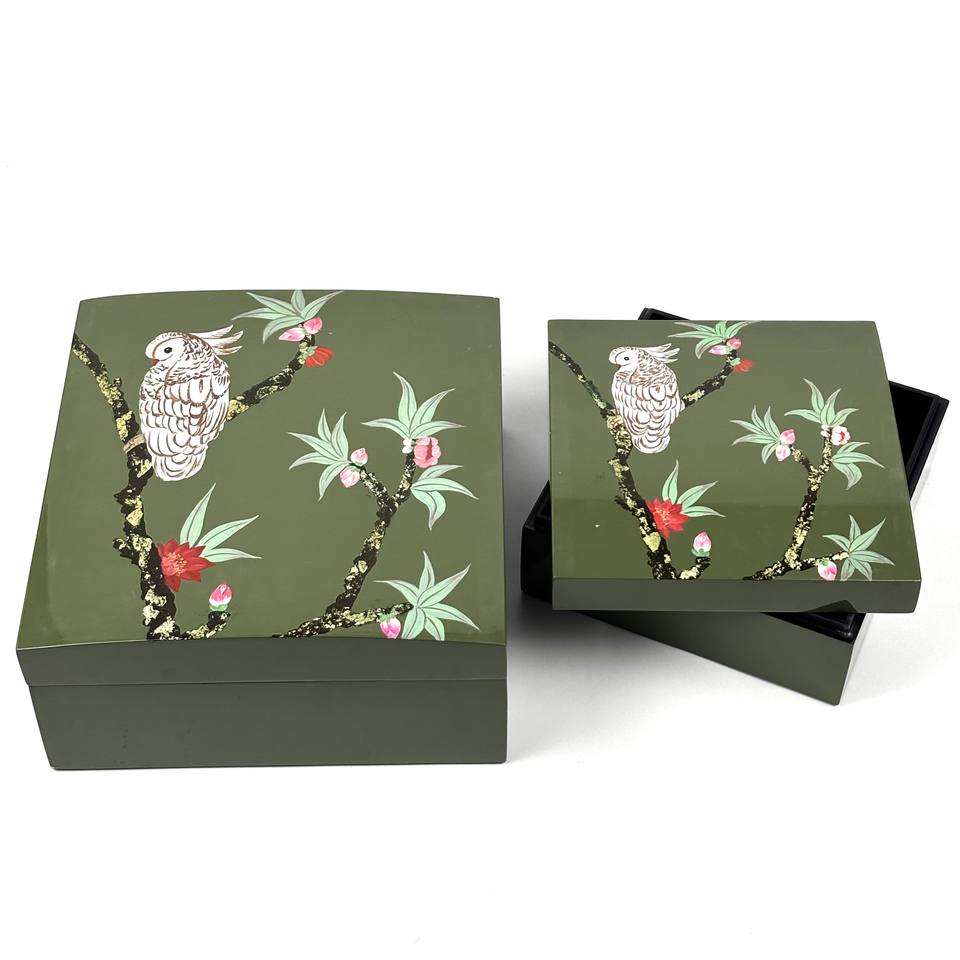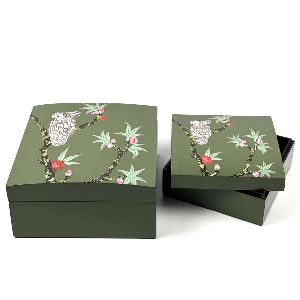 กล่องใส่แลคเกอร์ MDF สีเขียวทำด้วยมือกล่องเครื่องประดับตกแต่งลายนกและดอกไม้สำหรับตกแต่งบ้าน