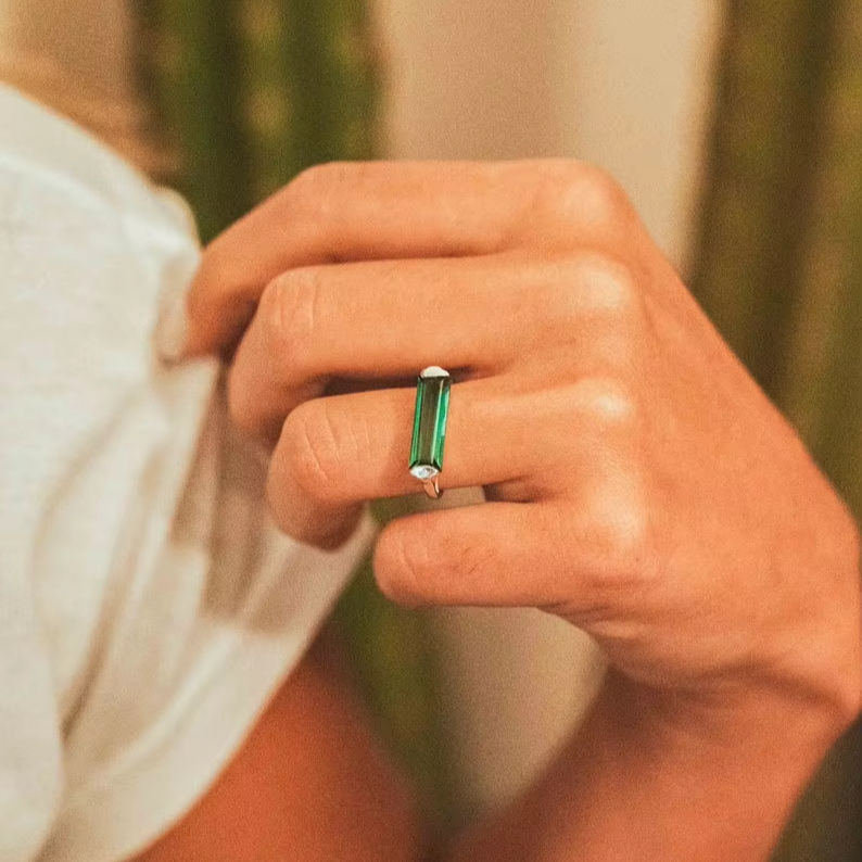 แหวนไฮโดรทัวร์มาลีนสีเขียวทำด้วยมือเครื่องประดับหินสี่เหลี่ยม925เงินสเตอร์ลิง