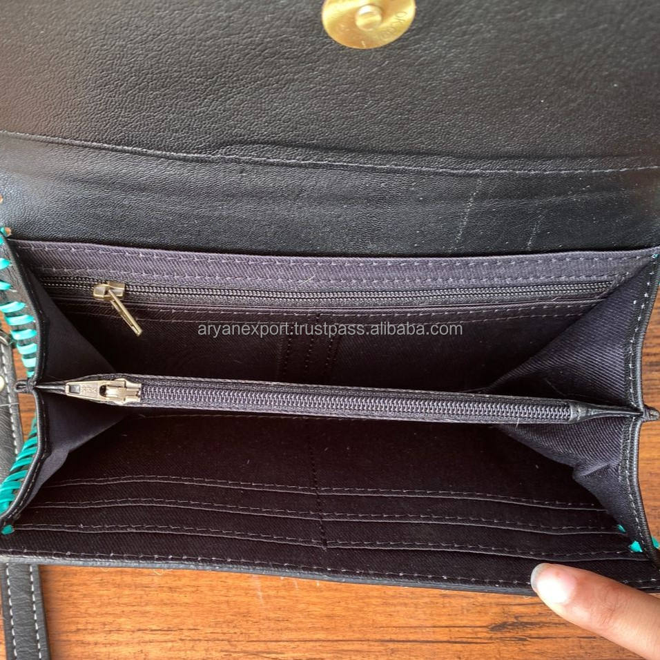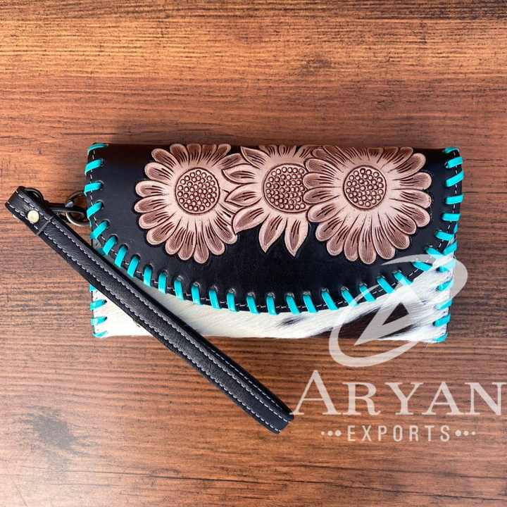 กระเป๋าสตางค์หนังแท้สำหรับผู้หญิงหนังแท้แบบตะวันตกมีที่ใส่บัตรเครดิตหนังวัวลายดอกไม้ทำมือ