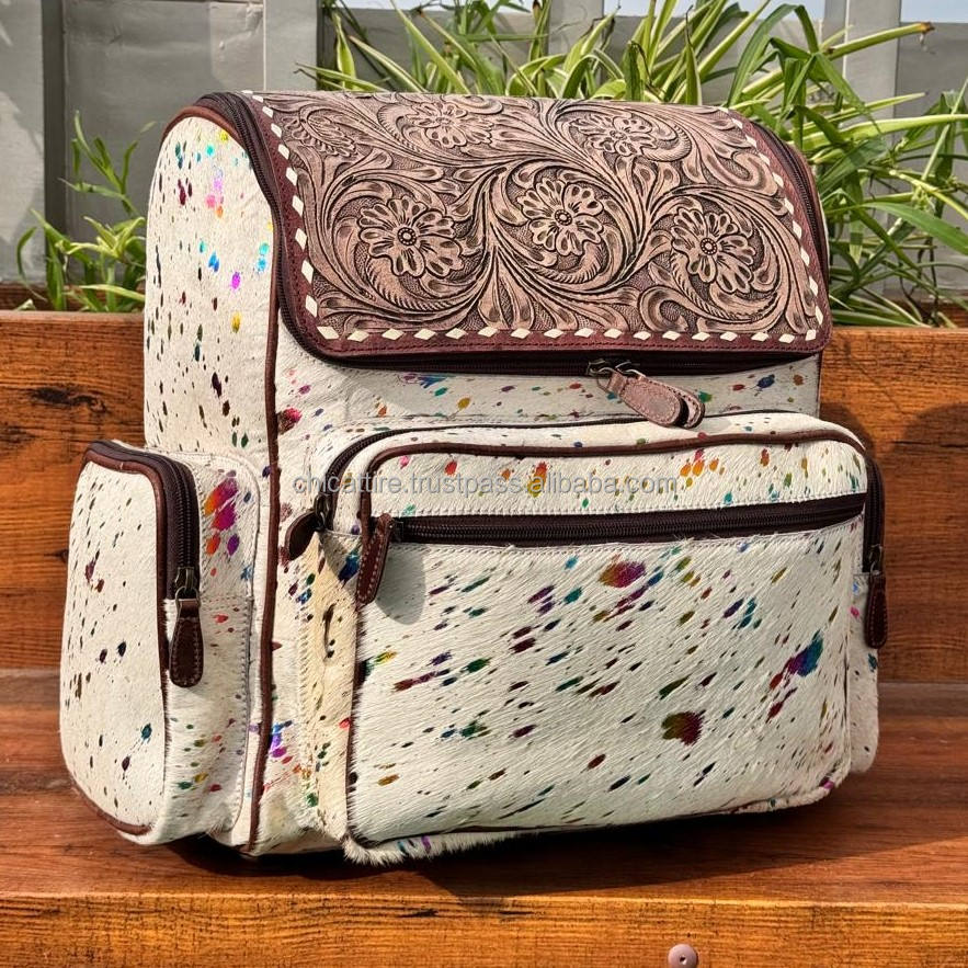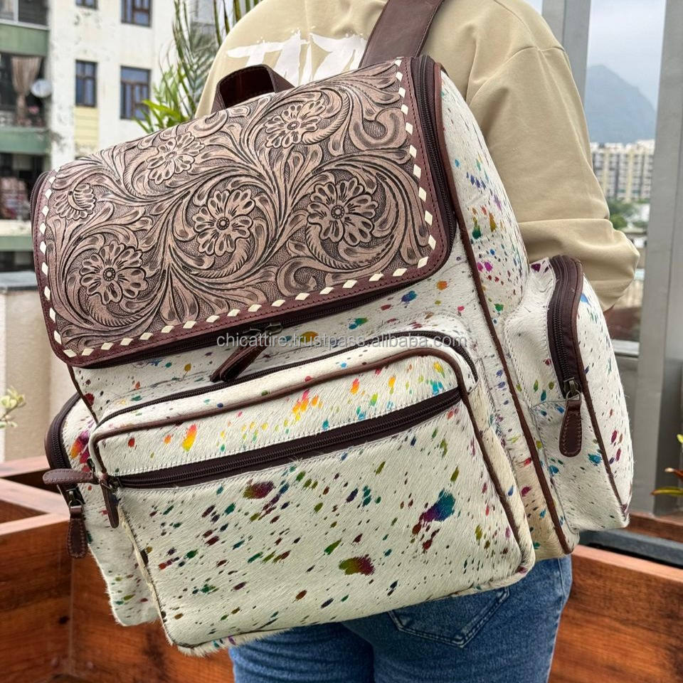 กระเป๋าเป้สะพายหลังผู้หญิงขนาดใหญ่ทำจากหนังวัวแท้ลายดอกไม้ทำจากหนังวัว100% แบบตะวันตก