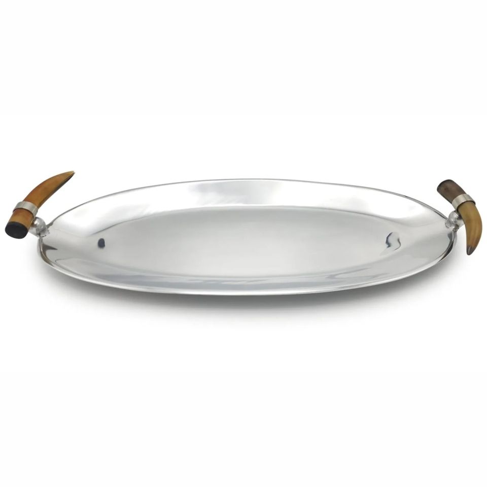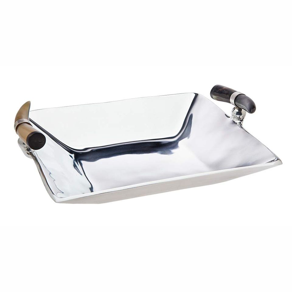 ถาดเสิร์ฟอะลูมิเนียมทรงสี่เหลี่ยมตอกลายด้วยมือ พร้อมหูจับทำจากวัสดุเลียนแบบเขาสัตว์ ถาดโลหะตกแต่งสุดหรูสำหรับโต๊ะกาแฟแบบออตโตมัน