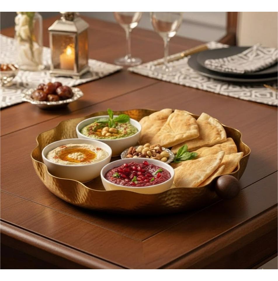 ชามเสิร์ฟอาหารทองแดงตีลายทำมือสุดหรู ขอบหยัก ถาดเสิร์ฟโลหะสำหรับงานปาร์ตี้ งานแต่งงาน รอมฎอน ของตกแต่งบ้าน