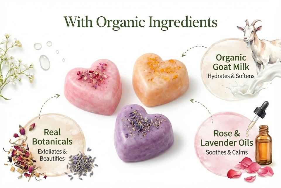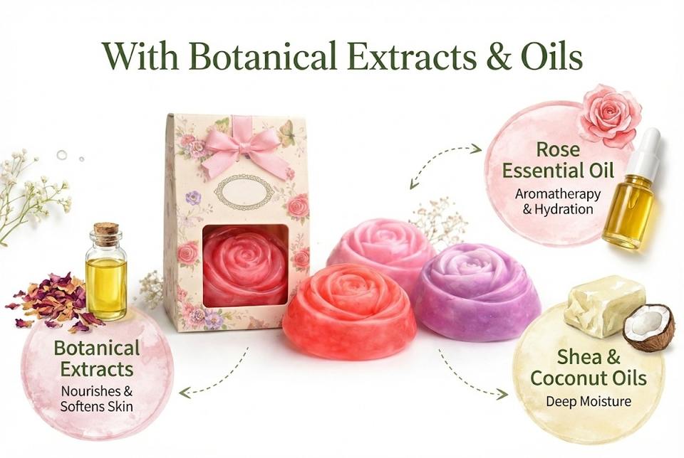 สบู่ทำมือรูปหัวใจ ไวท์เทนนิ่งจากธรรมชาติ วัตถุดิบออร์แกนิคได้รับการรับรองมาตรฐาน ISO บรรจุภัณฑ์กล่องของขวัญลายดอกไม้สุดหรู ขายส่งสำหรับอาบน้ำ