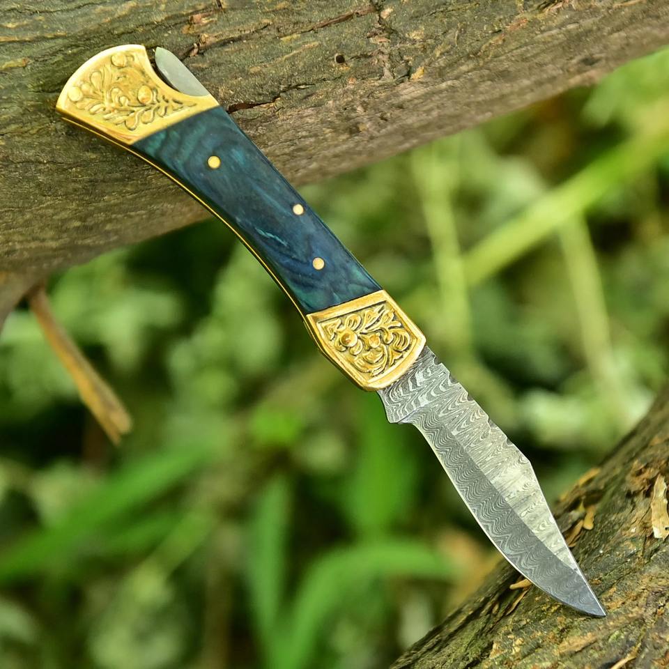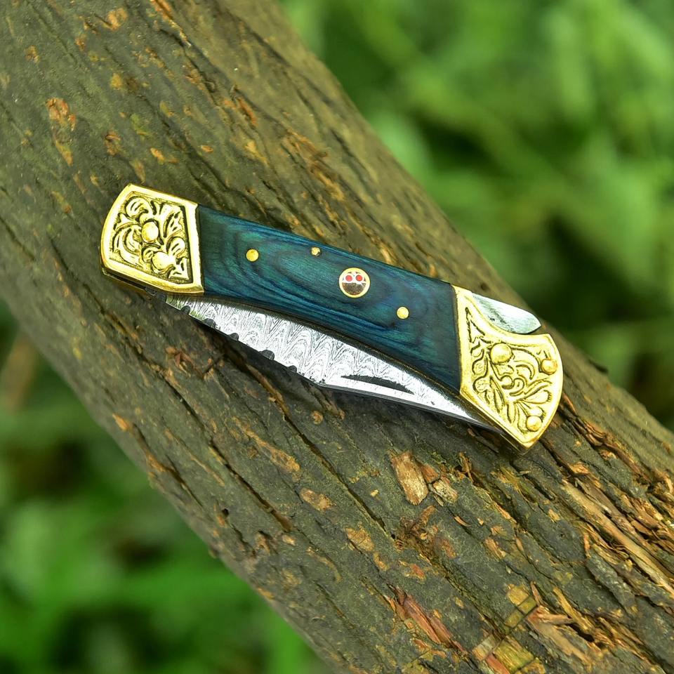 มีดพับทำมือสำหรับล่าสัตว์ ใบมีดเหล็กดามัสกัสสลักลาย ด้ามไม้ รับผลิตตามแบบ OEM ปรับแต่งได้