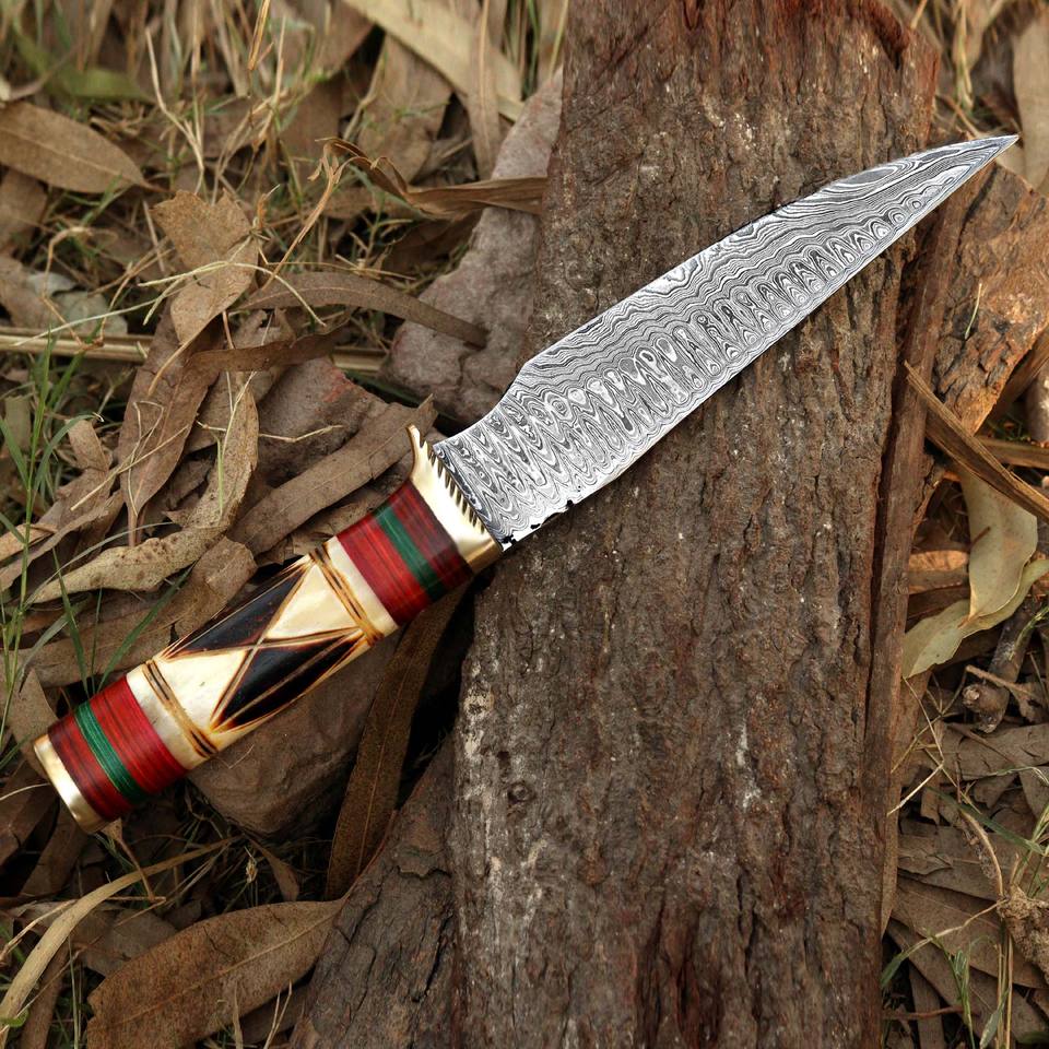 มีดล่าสัตว์ทำด้วยมือใบมีดแบบคงที่มีดเหล็กดามัสกัสตั้งแคมป์พร้อมปลอกหนังขายส่ง