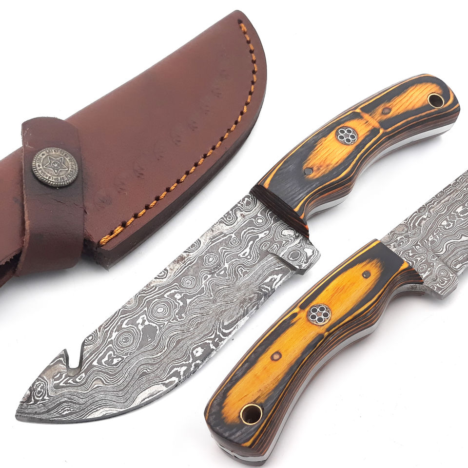 มีดล่าสัตว์ปรับแต่งได้พร้อมใบมีดสแตนเลสและที่จับไม้ทำด้วยมือเหล็กดามัสกัสสำหรับตั้งแคมป์แบบทำมือ