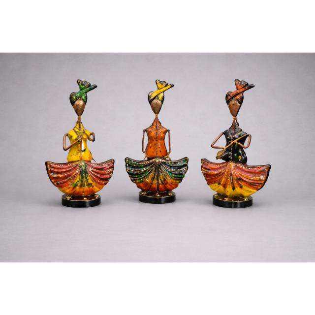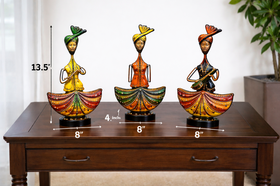 ชุดตุ๊กตาเหล็กทำมือรูปนักดนตรีชาวอินเดีย 3 ชิ้น สำหรับตกแต่งโต๊ะ ตกแต่งบ้าน ของขวัญสำหรับเทศกาลและงานขึ้นบ้านใหม่