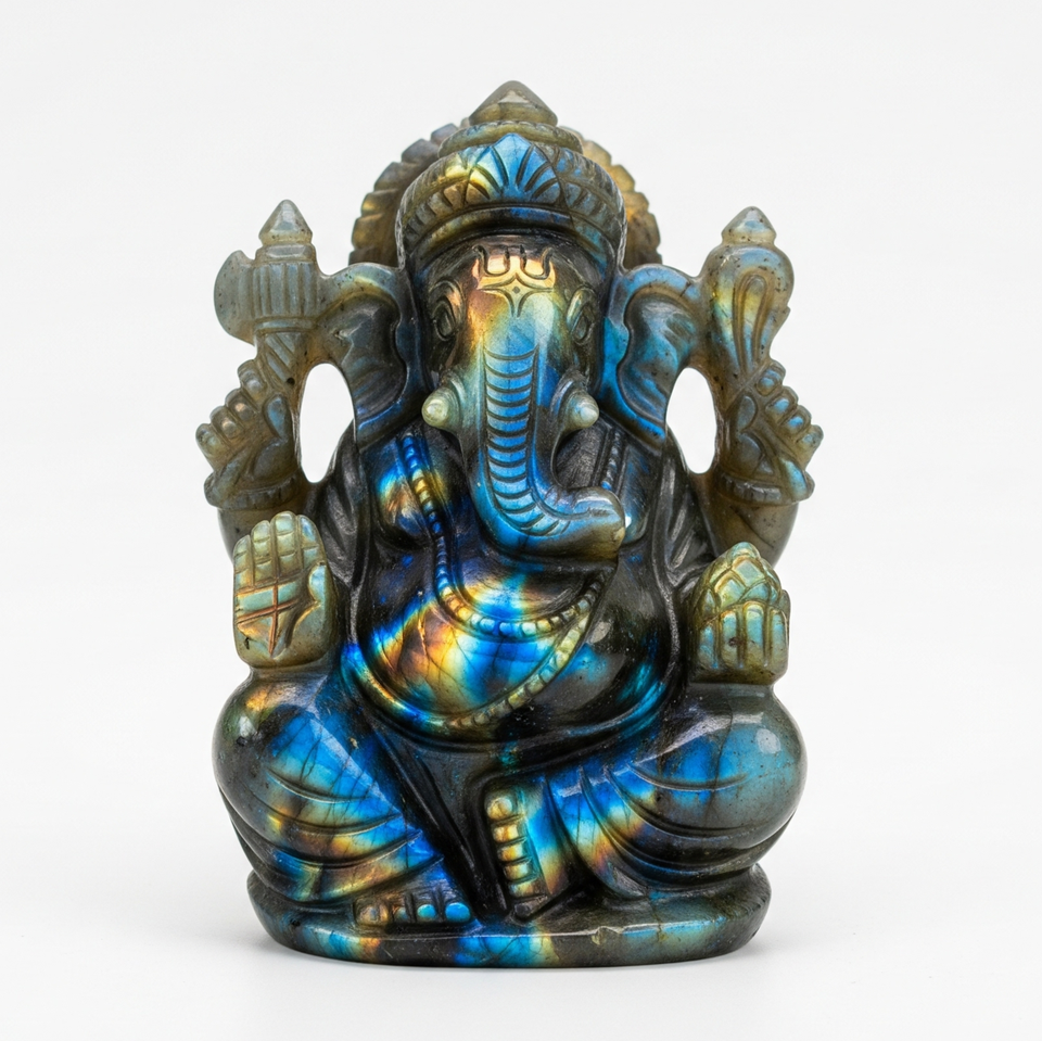รูปปั้นพระพิฆเนศอินเดียแกะสลักพลอยลาบราดอไรต์ธรรมชาติทำด้วยมืองานหัตถกรรมหินกึ่งมีค่าสำหรับแกะสลักทางศาสนา