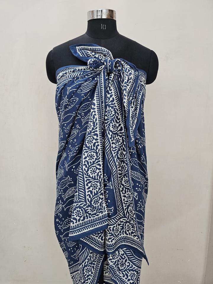 Handmade Indian Beach Cover Ups Swimsuit Bikinis Indigo Blue Fish Printed Block-Printed Cotton Sarong Paisley Pattern Beachwear