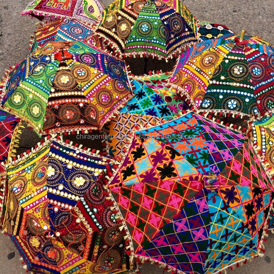 ร่มพิมพ์ลายสไตล์โบฮีเมียนอินเดียทำด้วยมือร่มกันแดดแบบดั้งเดิมวัสดุผ้าฝ้ายแบบชนเผ่าอินเดียดีไซน์คลาสสิกสีสันสดใสด้วยมือ