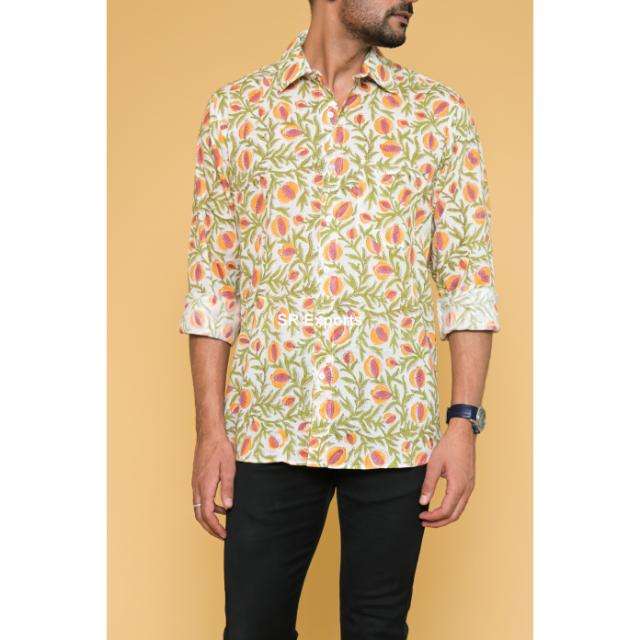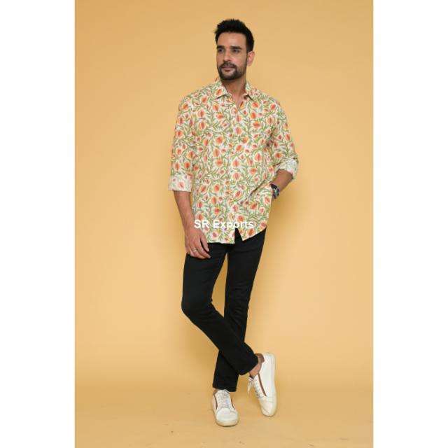 เสื้อเชิ้ตพิมพ์ลายบล็อกผ้าฝ้ายอินเดียแท้ 100% ทำมือ สไตล์โบโฮ แขนยาว ระบายอากาศได้ดี ลายดอกไม้ ลำลอง ใส่ได้ทั้งฤดูร้อนและชายหาด กระดุมเขาสัตว์