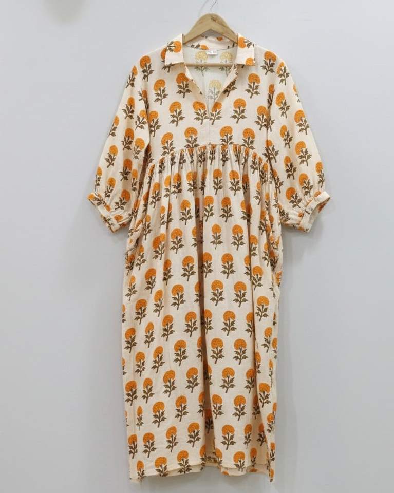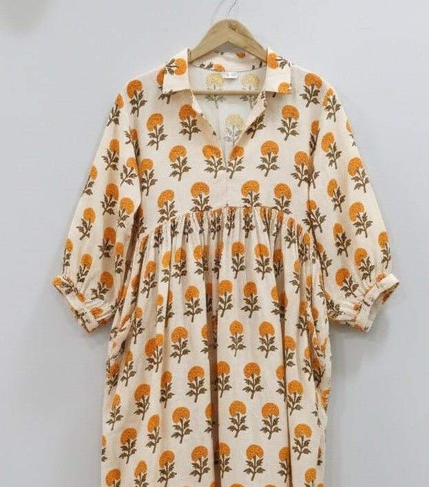 ชุดเดรสผ้าฝ้ายอินเดียทำมือสำหรับผู้หญิง | ชุดทำงานทางการ เป็นมิตรกับสิ่งแวดล้อม ระบายอากาศได้ดี ทรงเอไลน์ ลายดอกไม้ วาดด้วยมือ ธรรมชาติ