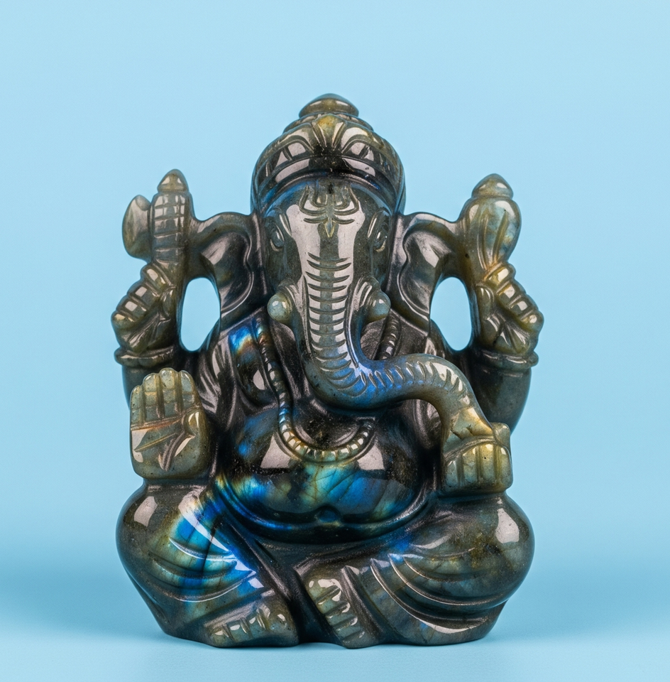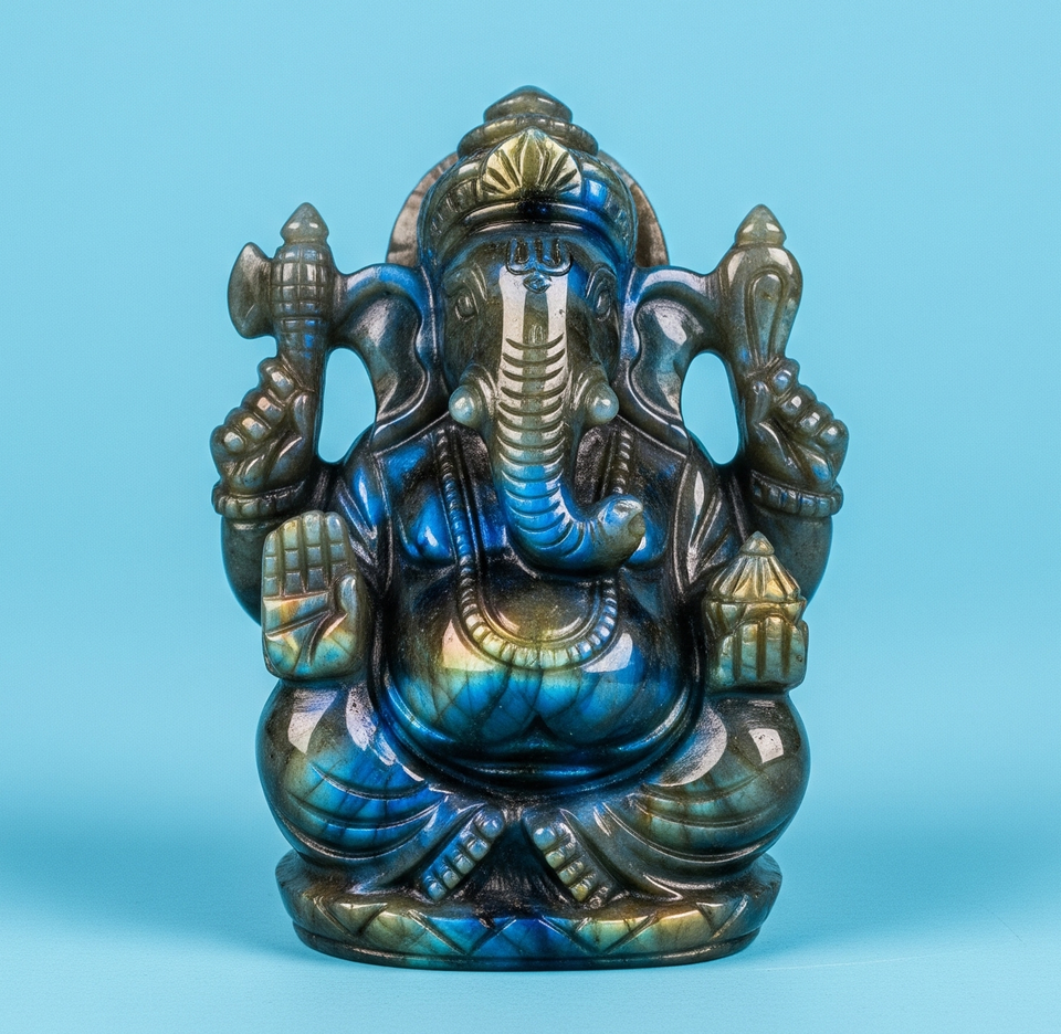 รูปปั้นพระพิฆเนศอินเดียทำด้วยมือแกะสลักพลอยลาบราดอไรต์แกะสลักทางศาสนาหัตถกรรมแกะสลักกึ่งมีค่าจากอินเดีย