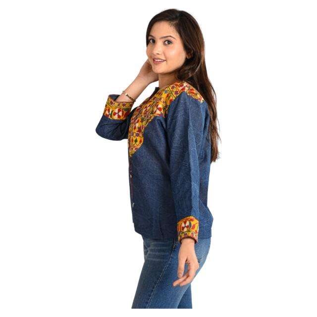 แจ็กเก็ตปักผ้ายีนส์แบบกลับด้านได้ทำด้วยมือสไตล์อินเดียสำหรับผู้หญิงชุดลำลองและงานปาร์ตี้โบฮีเมียนชั้นสั้นสำหรับฤดูใบไม้ร่วง