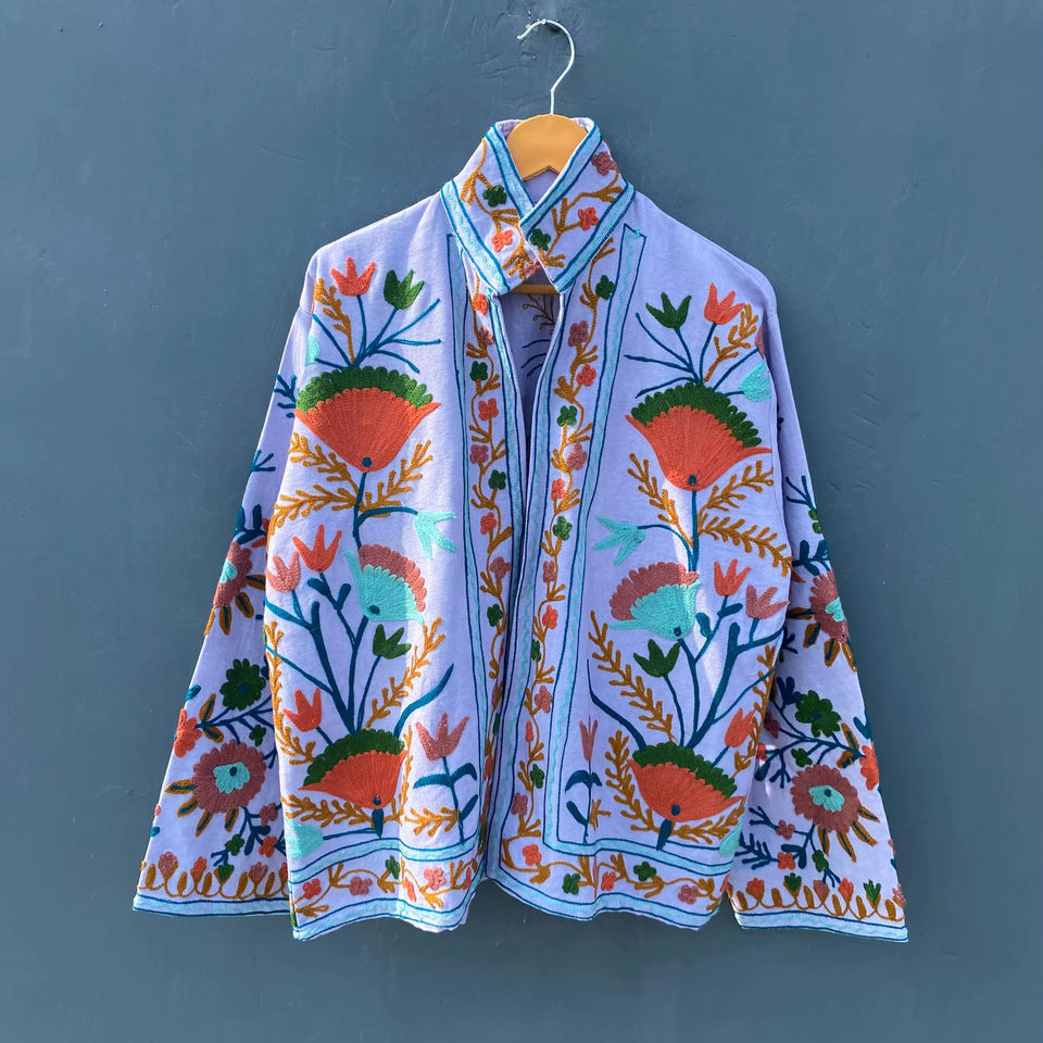 Suzani ทำด้วยมือเสื้อแจ็กเก็ตผ้าฝ้ายปักลายดอกไม้ระบายอากาศทำในอินเดียทำด้วยมือสไตล์วินเทจอินเดีย