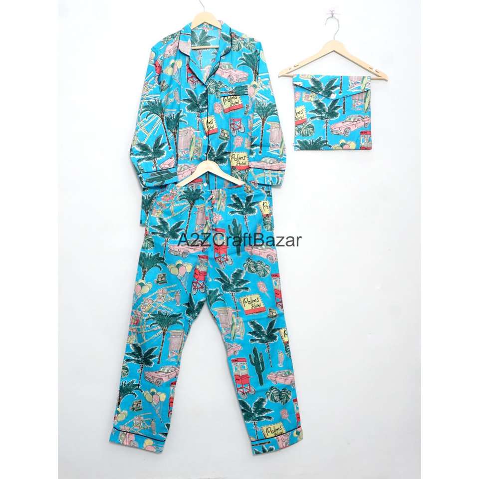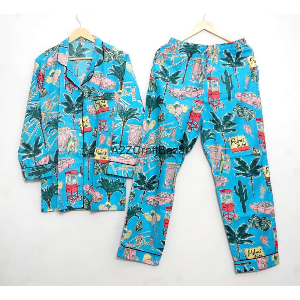 Handmade Indian Women's Summer Full-Length Cotton Pajama Set Long Sleeves Drawstring Closure Floral Print Breathable Knitted