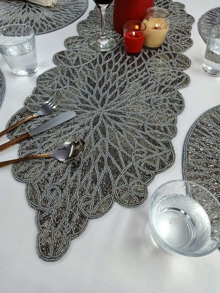 ผ้าปูโต๊ะลูกปัดถักลายดอกไม้ผ้าแจ็คการ์ดสีเงินลายดอกเบญจมาศทำด้วยมือ