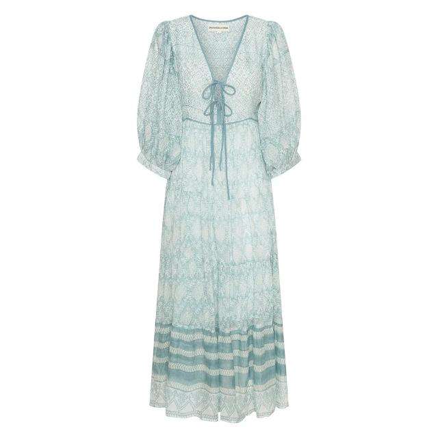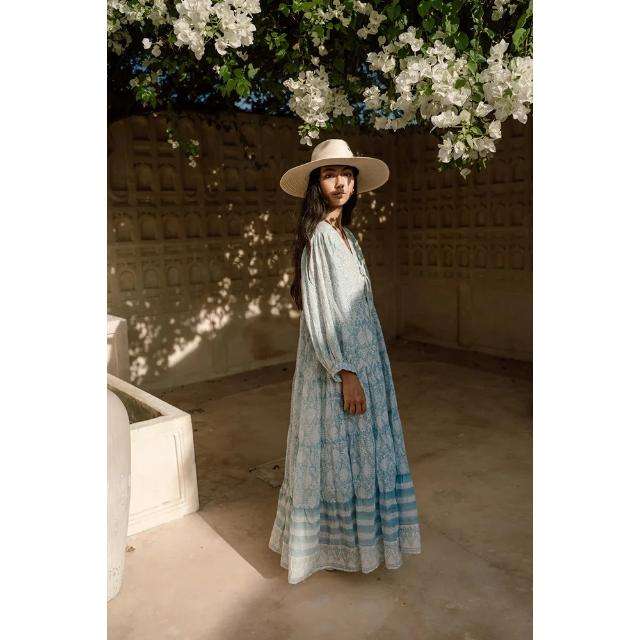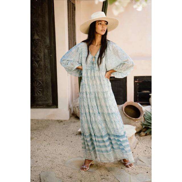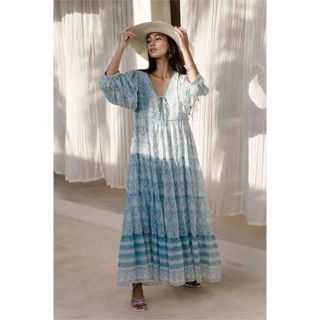 ชุดเดรสยาวลายดอกมะลิทำมือ สีทะเลหมอก สวยงาม ลายมัดย้อม ซักได้ ผ้าฝ้าย 100% ผลิตอย่างมีจริยธรรมโดยช่างฝีมือ