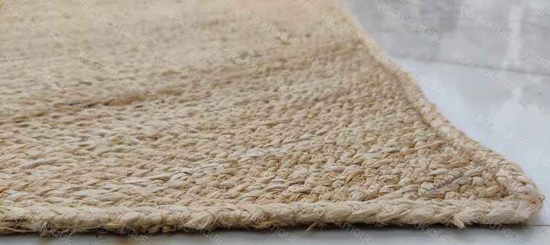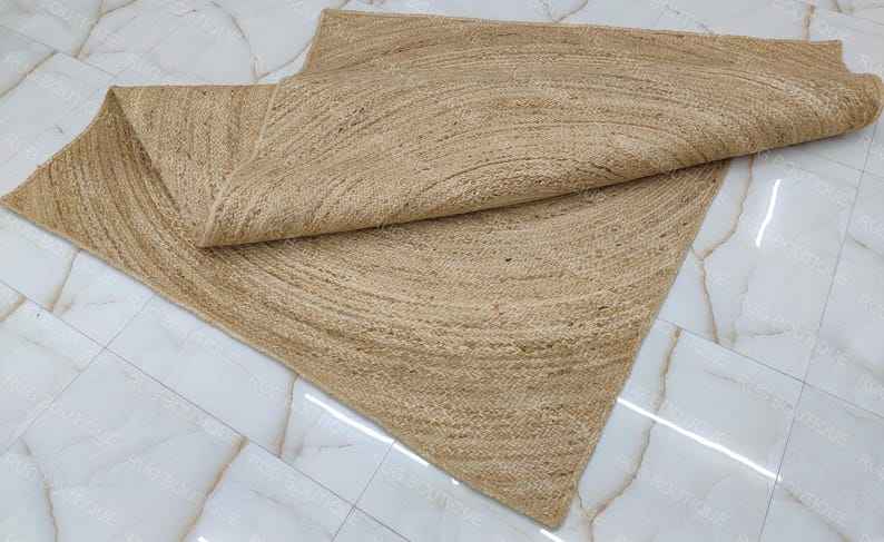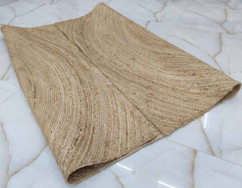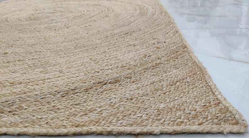 พรมปูพื้นทรงกลมทำมือจากปอกระเจา ลายขอบขาวดำ สไตล์โบโฮ ทำจากเส้นใยธรรมชาติถักด้วยมือ เหมาะสำหรับตกแต่งห้องนั่งเล่นสไตล์ฟาร์มเฮาส์